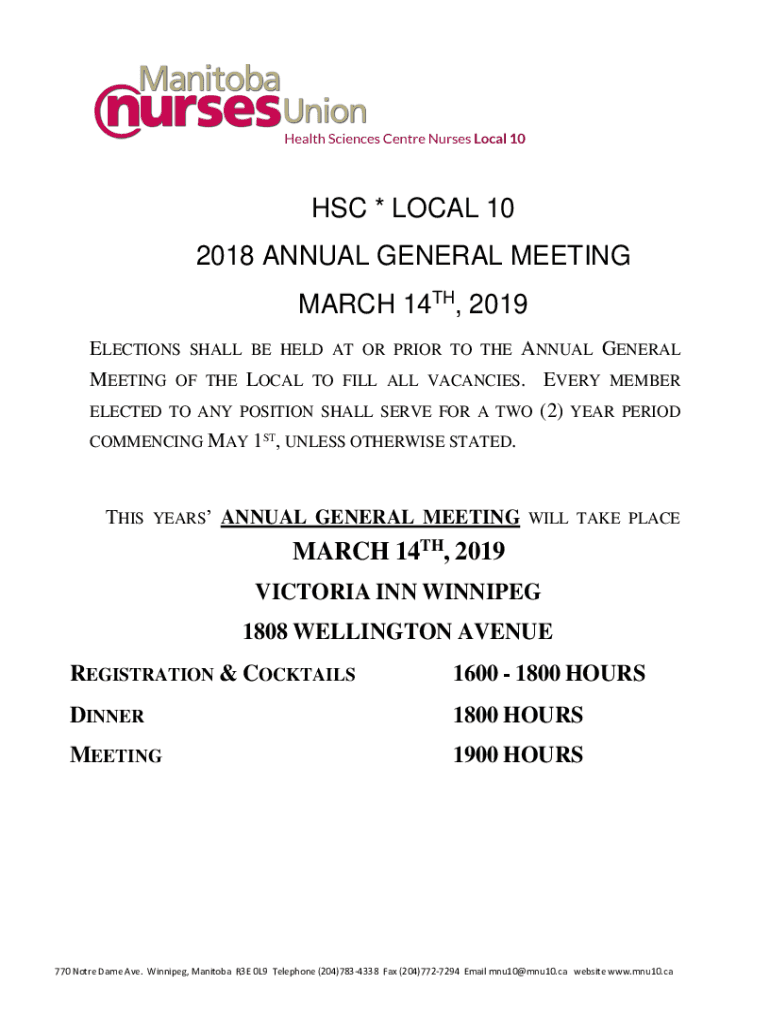 HSC * LOCAL 10 2018 ANNUAL GENERAL MEETING MARCH 14TH, 2019 ELECTIONS SHALL BE HELD AT OR PRIOR TO THE ANNUAL GENERAL MEETING OF THE LOCAL TO FILL ALL VACANCIES. EVERY MEMBER ELECTED TO ANY POSITION