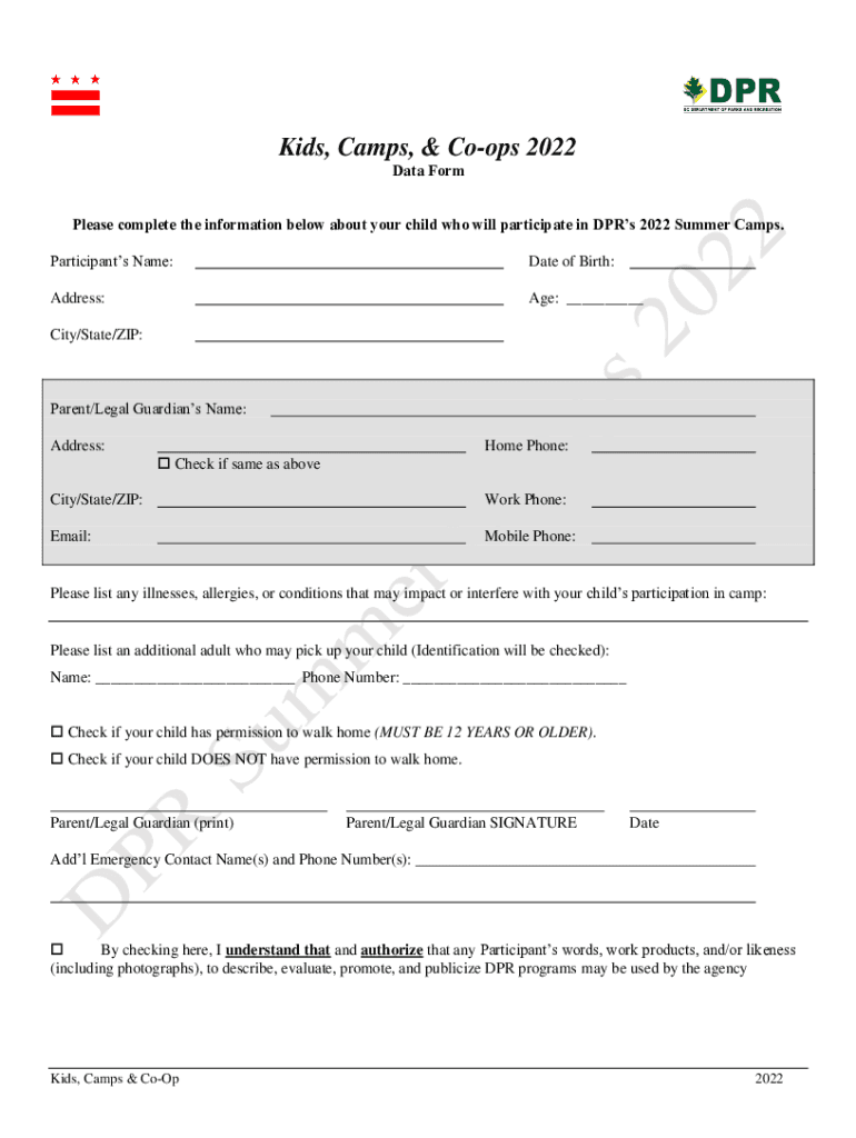 Kids, Camps, & Coops 2022 Data Form Please complete the information below about your child who will participate in GPRS 2022 Summer Camps. Participants Name:Date of Birth:Address:Age: ___City/State/ZIP:Parent/Legal
