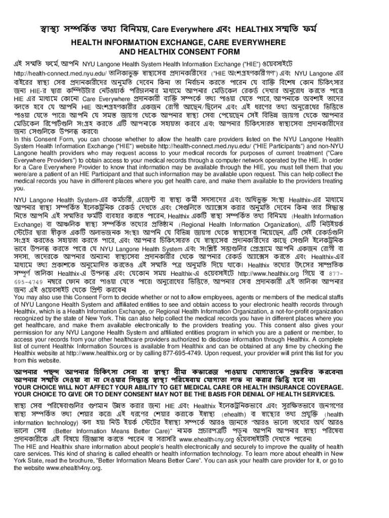 , Care Everywhere HEALTH, HEALTH INFORMATION EXCHANGE, CARE EVERYWHERE AND HEALTH CONSENT FORM, NYU Lang one Health System Health Information Exchange (HIE) http://healthconnect.med.nyu.edu/