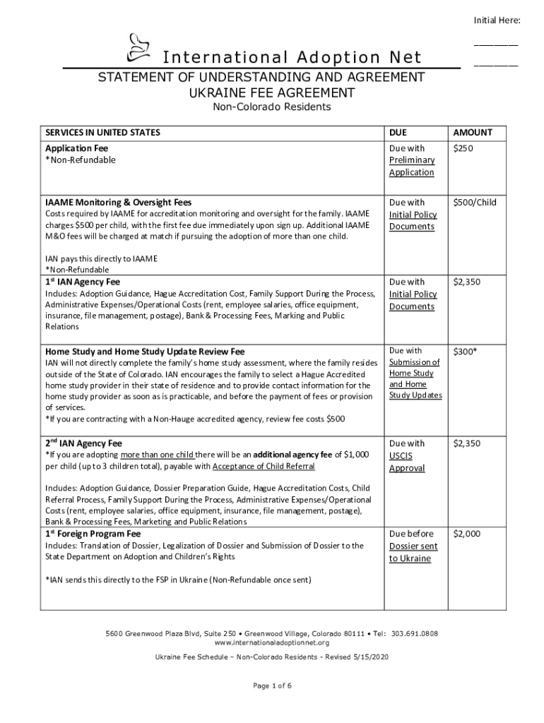 Initial Here: ___International Adoption Net___STATEMENT OF UNDERSTANDING AND AGREEMENT UKRAINE FEE AGREEMENT NonColorado Residents SERVICES IN UNITED STATES Application Fee *Nonrefundable Due with