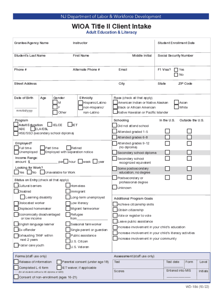 NJ Department of Labor & Workforce DevelopmentWIOA Title II Client Intake Adult Education & LiteracyGrantee/Agency NameInstructorStudent Enrollment DateStudents Last NameFirst Telephone #Alternate