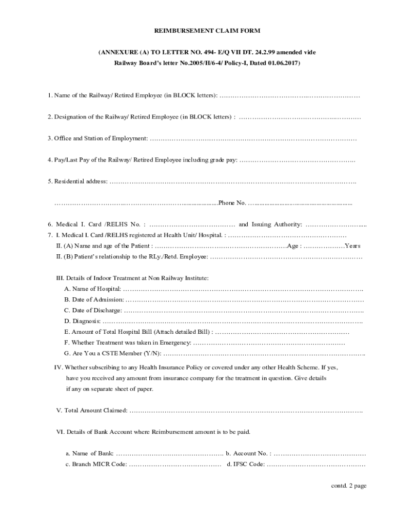 REIMBURSEMENT CLAIM FORM(Appendix (A) TO LETTER NO. 494 E/Q VII DT. 24.2.99 amended vide Railway Boards letter No.2005/H/64/ Policy, Dated 01.06.2017)1. Name of the Railway/ Retired Employee (in BLOCK