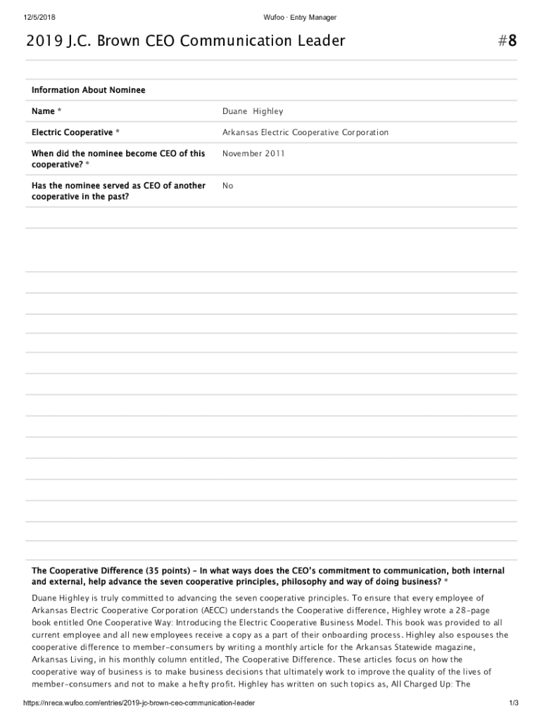 12/5/2018Wufoo Entry Manager2019 J.C. Brown CEO Communication Leader#8Information About Nominee Name *Duane HighleyElectric Cooperative *Arkansas Electric Cooperative CorporationWhen did the nominee