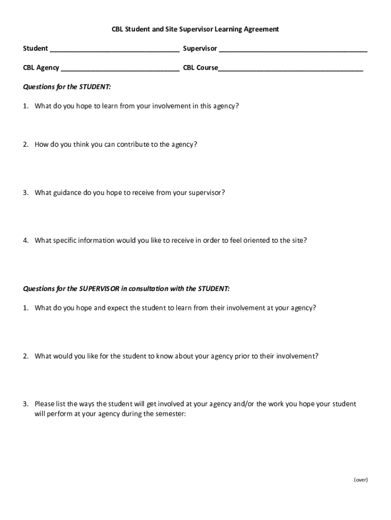 CBL Student and Site Supervisor Learning Agreement Student ___ Supervisor ___ CBL Agency ___ CBL Course___ Questions for the STUDENT: 1. What do you hope to learn from your involvement in this agency?2.