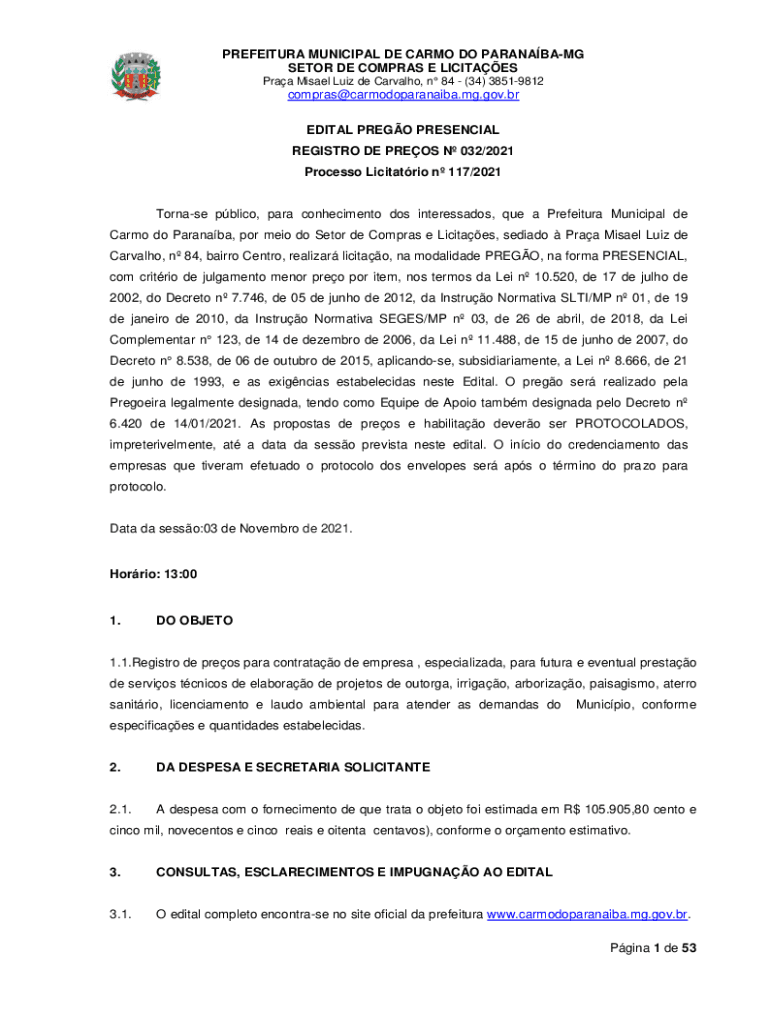 PREFECTURE MUNICIPAL DE CARGO DO PARANASAL SECTOR DE COM PRAS E LICIT AES Prey Mikael Luiz de Carvalho, n 84 (34) 38519812compras@carmodoparanaiba.mg.gov.br EDIT AL PRESO PRESENCE REGISTRY DE PRESS