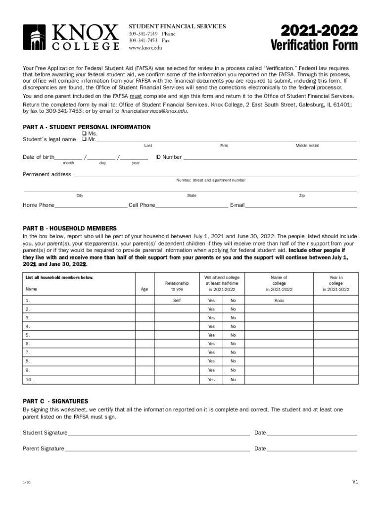 20212022 Verification FormSTUDENT FINANCIAL SERVICES 3093417149 Phone 3093417453 Fax www.knox.eduYour Free Application for Federal Student Aid (FAFSA) was selected for review in a process called Verification.
