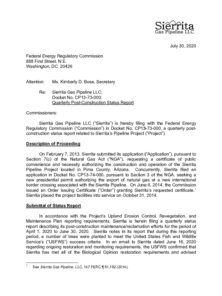 July 30, 2 2020 Federal Energy Re regulatory Co commission 888 Firs st Street, N. E. Washing ton, DC 20426 2 Attention n: Re: RMS. Kimberly K D. Bose, Sec secretary Sierra Gas pipeline LLC; Docket
