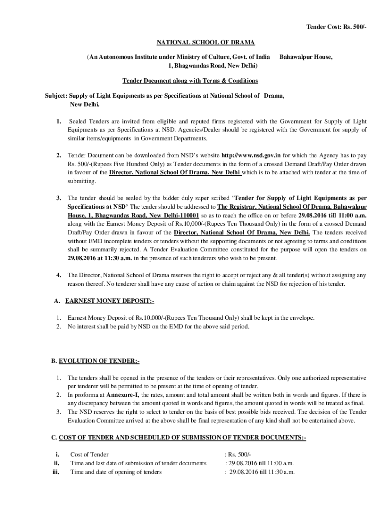 Tender Cost: Rs. 500/NATIONAL SCHOOL OF DRAMA (An Autonomous Institute under Ministry of Culture, Govt. of India 1, Bhagwandas Road, New Delhi)Bahawalpur House, Tender Document along with Terms &