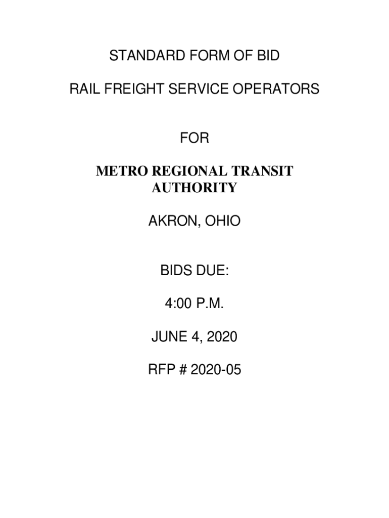 STANDARD FORM OF BID RAIL FREIGHT SERVICE OPERATORS METRO REGIONAL TRANSIT AUTHORITY AKRON, OPIOIDS DUE: 4:00 P.M. JUNE 4, 2020, RFP # 202005416 Kenmore Boulevard (330) 7627267Akron, Ohio 443011099