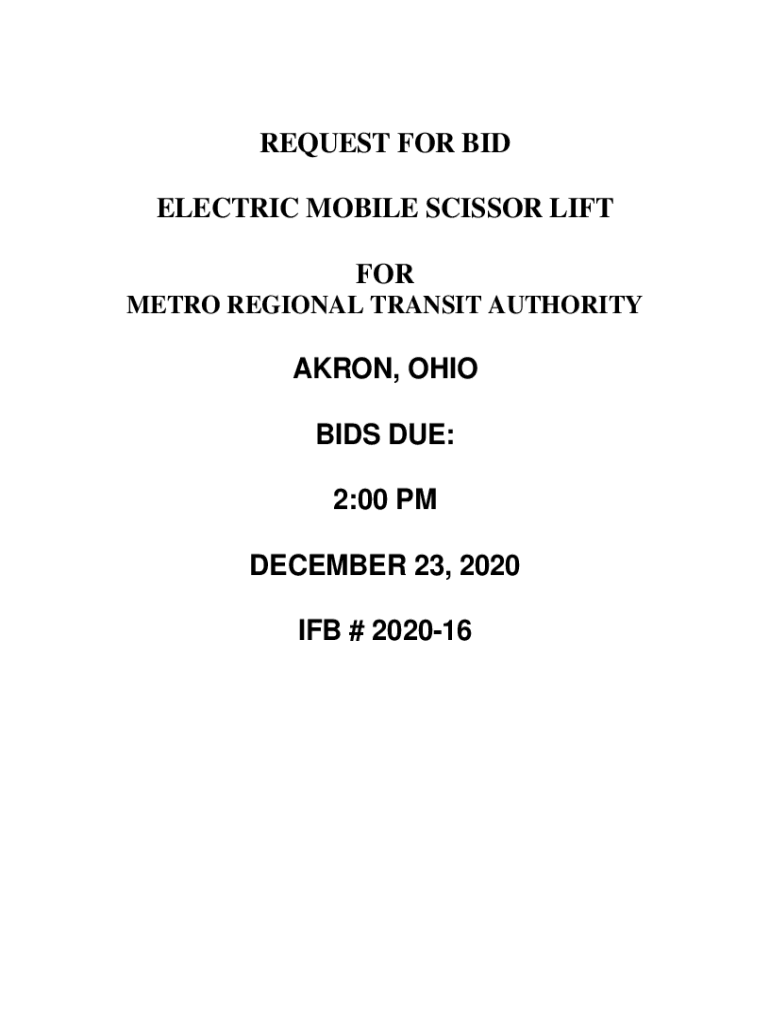 REQUEST FOR BID ELECTRIC MOBILE SCISSOR LIFT FOR METRO REGIONAL TRANSIT AUTHORITYAKRON, OHIO BIDS DUE: 2:00 PM DECEMBER 23, 2020, IF # 202016416 Kenmore Boulevard Akron, Ohio 443011099LEGAL NOTICE
