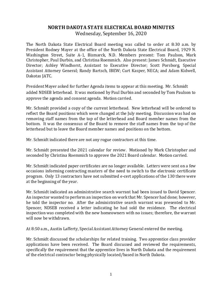NORTH DAKOTA STATE ELECTRICAL BOARD MINUTES Wednesday, September 16, 2020The North Dakota State Electrical Board meeting was called to order at 8:30 a.m. by President Rodney Mayer at the office of