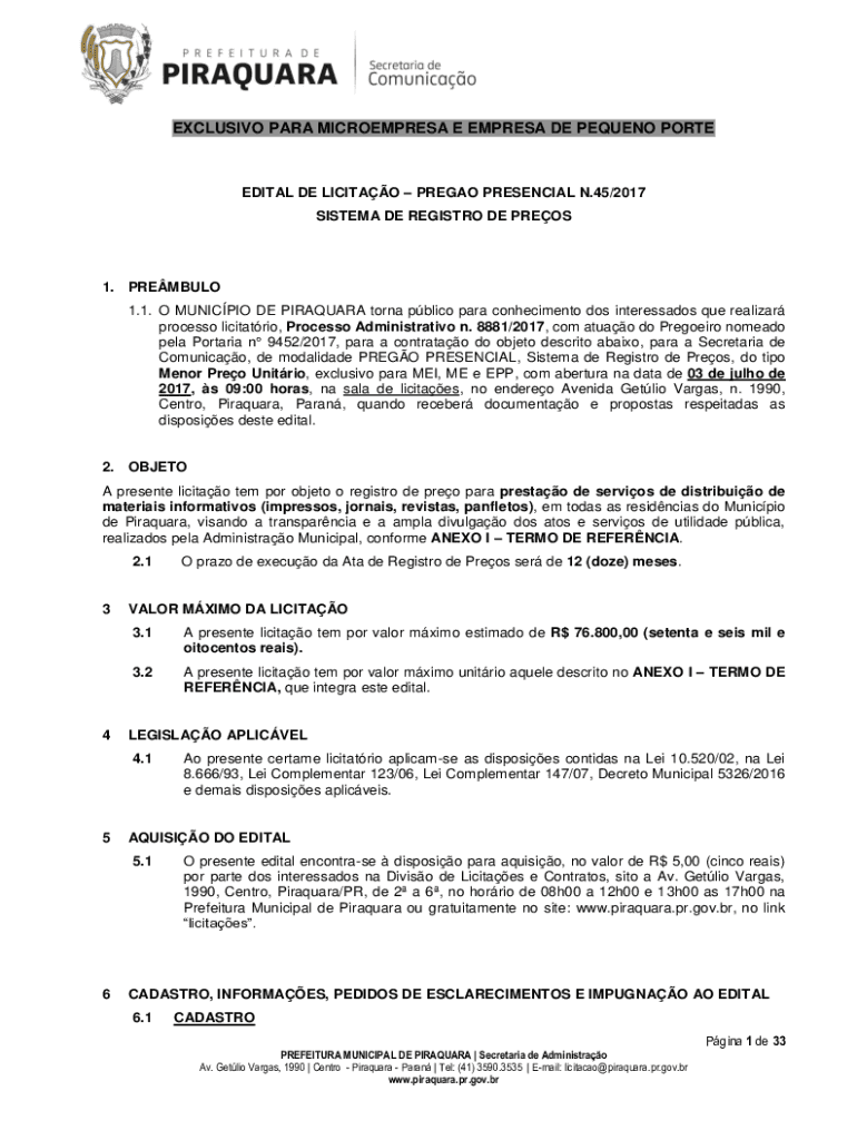 EXCLUSIVE PARA MICROAMPERES E EMPRESS DE PERCENT PORTEEDITAL DE LICIT AO PREGAO PRESENCE N.45/2017 SYSTEM DE REGISTRY DE PREOS1. PREMIUM 1.1. O MUNICIPAL DE PARAQUAT torn public para conhecimento