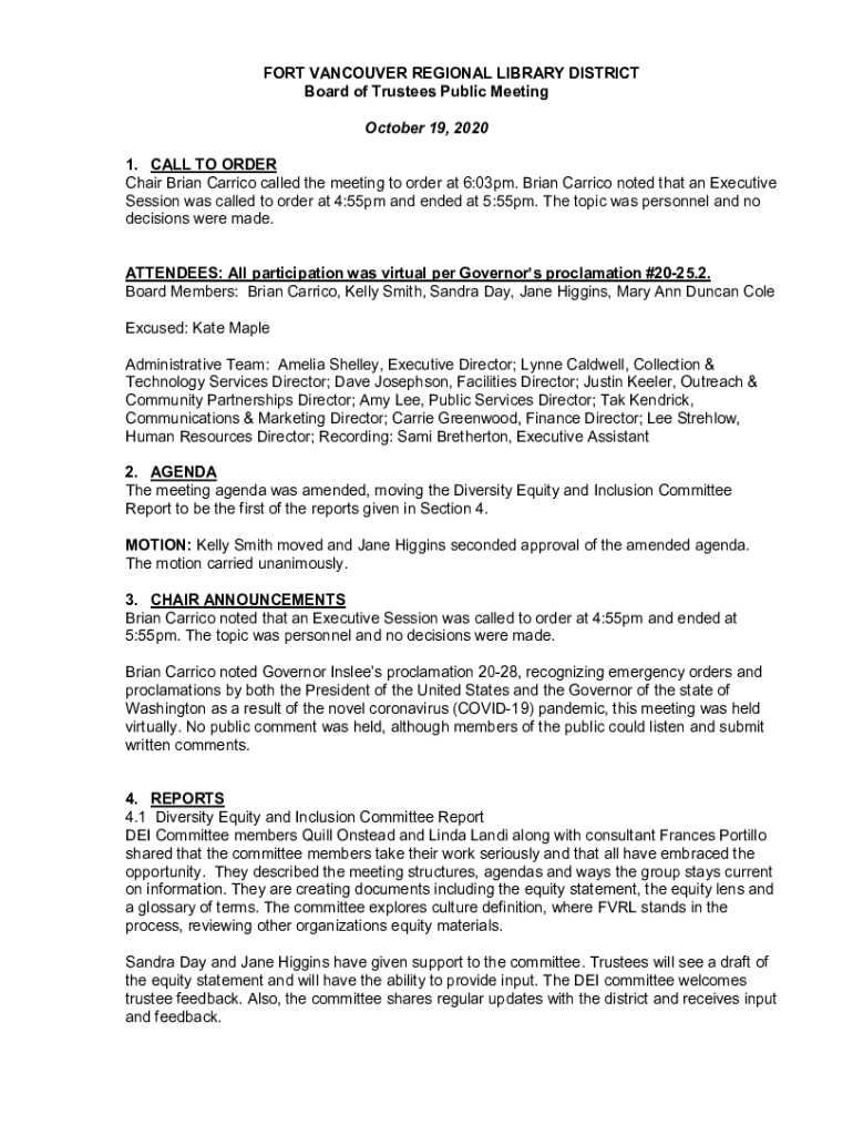 FORT VANCOUVER REGIONAL LIBRARY DISTRICT Board of Trustees Public Meeting October 19, 2020 1. CALL TO ORDER Chair Brian Carried called the meeting to order at 6:03pm. Brian Carried noted that an Executive