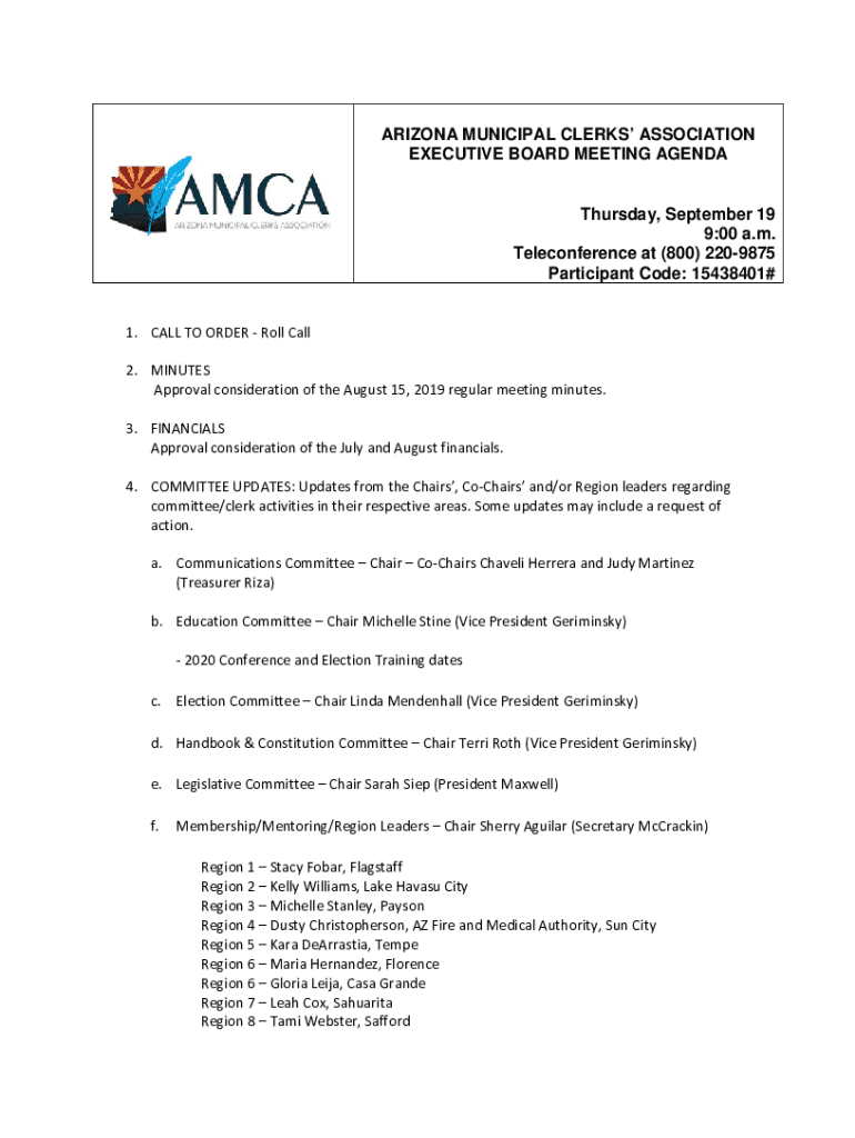 ARIZONA MUNICIPAL CLERKS ASSOCIATION EXECUTIVE BOARD MEETING AGENDA Thursday, September 19 9:00 a.m. Teleconference at (800) 2209875 Participant Code: 15438401# 1. CALL TO ORDER Roll Call 2. MINUTES