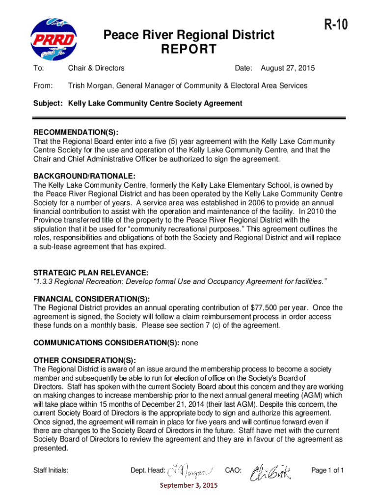 Peace River Regional District REPORT To:Chair & Directorate:August 27, 2015From:Trish Morgan, General Manager of Community & Electoral Area ServicesSubject: Kelly Lake Community Center Society AgreementRECOMMENDATION(S):