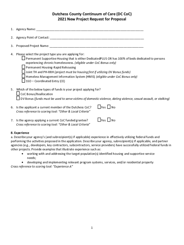 Dutchess County Continuum of Care (DC COC) 2021 New Project Request for Proposal 1. Agency Name: ___ 2. Agency Point of Contact: ___ 3. Proposed Project Name: ___ 4. Please select the project type