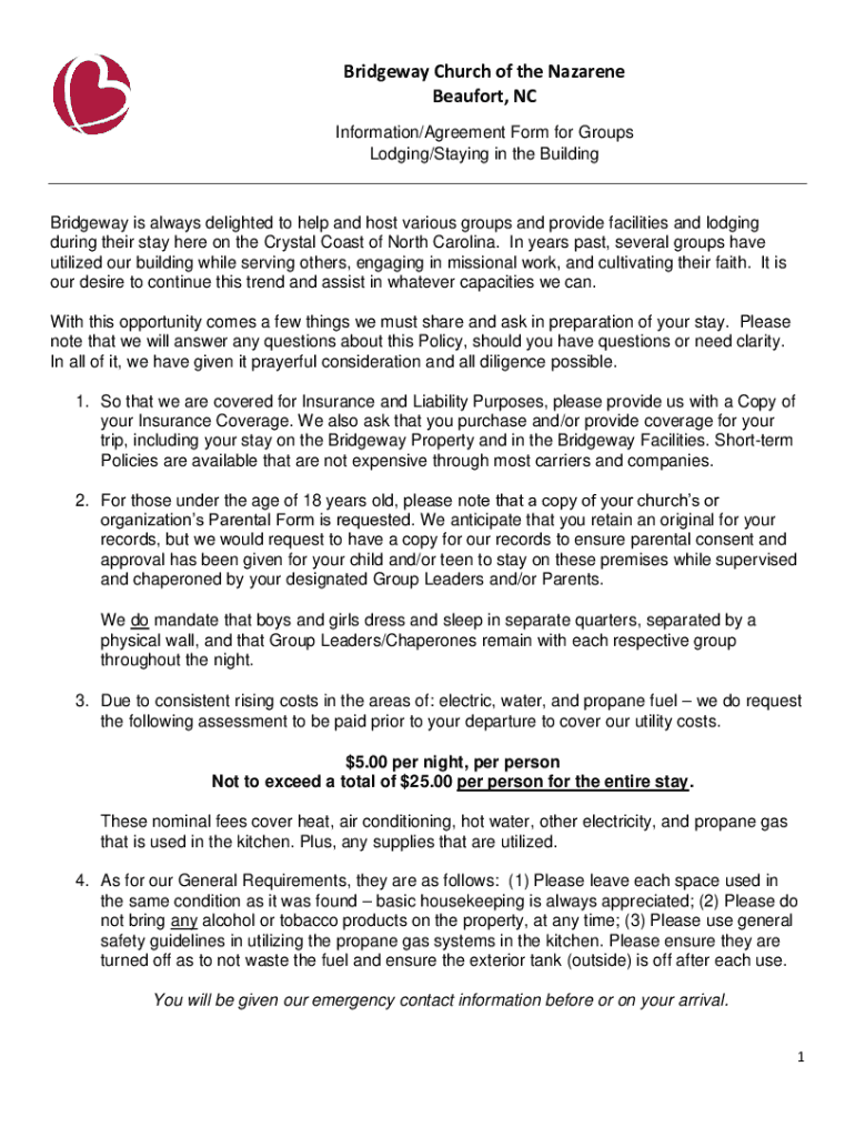 Bridleway Church of the Nazarene Beaufort, NC Information/Agreement Form for Groups Lodging/Staying in the BuildingBridgeway is always delighted to help and host various groups and provide facilities