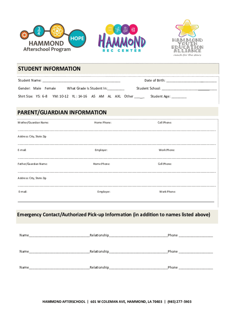 STUDENT INFORMATION Student Name: ___ Gender: Male Female Shirt Size: IS: 68What Grade Is Student In:___YM: 1012 YL : 1416Date of Birth: ___ ___ Student School: ___AS AM AL AXL Other ___ ____Student