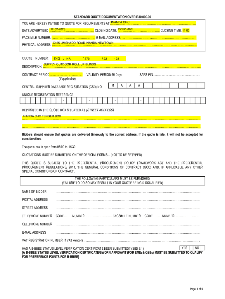 STANDARD QUOTE DOCUMENTATION OVER R30 000.00 INLAND CHC YOU ARE HEREBY INVITED TO QUOTE FOR REQUIREMENTS AT:.22022023 17022023 DATE ADVERTISED:... CLOSING DATE: ... CLOSING TIME: 11:00FACSIMILE NUMBER: