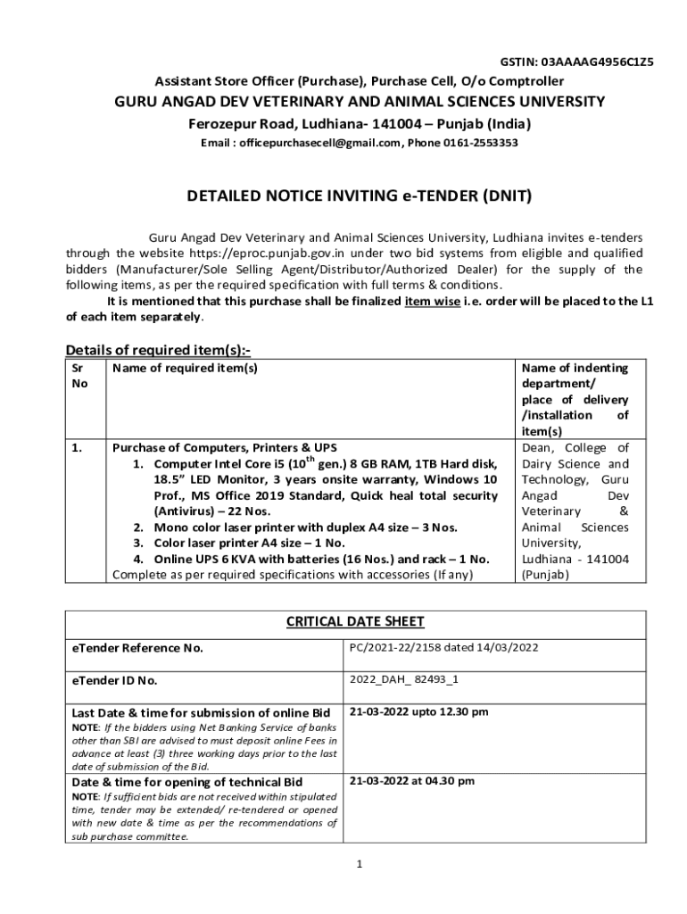 GTIN: 03AAAAG4956C1Z5Assistant Store Officer (Purchase), Purchase Cell, O/o ComptrollerGURU AN GAD DEV VETERINARY AND ANIMAL SCIENCES UNIVERSITY Ferozepur Road, Ludhiana 141004 Punjab (India) Email