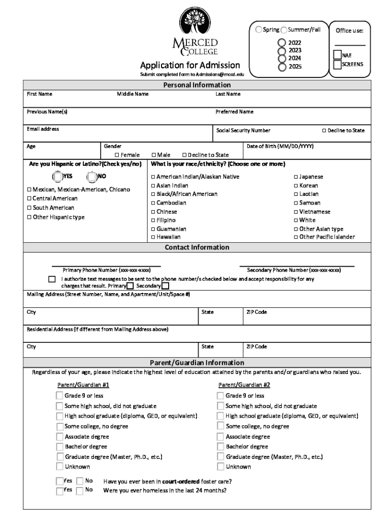 SPR brings umm MMR her, her//Falloff ice use:2022 2023 2024 2025Application for Admission SCREENSSubmit completed form to Admissions@mccd.eduFirst Impersonal InformationMiddle Nameless NamePrevious