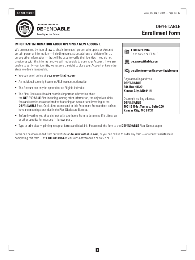 ABLE_DE_EN_112022-Page 1 of 12DO NOT STAPLEDEPENDABLEEnrollment Form IMPORTANT INFORMATION ABOUT OPENING A NEW ACCOUNT. We are required by federal law to obtain from each person who opens an Account