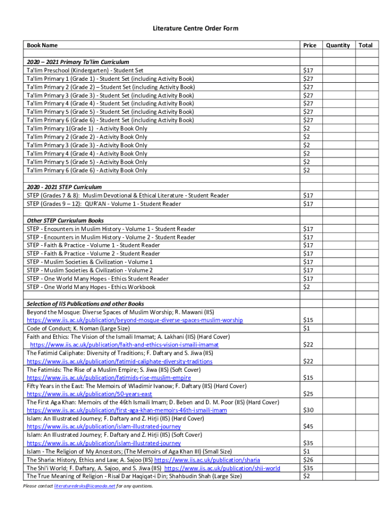 Literature Center Order Form Book NamePrice2020 2021 Primary Ta\'LIM Curriculum Ta\'LIM Preschool (Kindergarten) Student Set Ta\'LIM Primary 1 (Grade 1) Student Set (including Activity Book) Ta\'LIM
