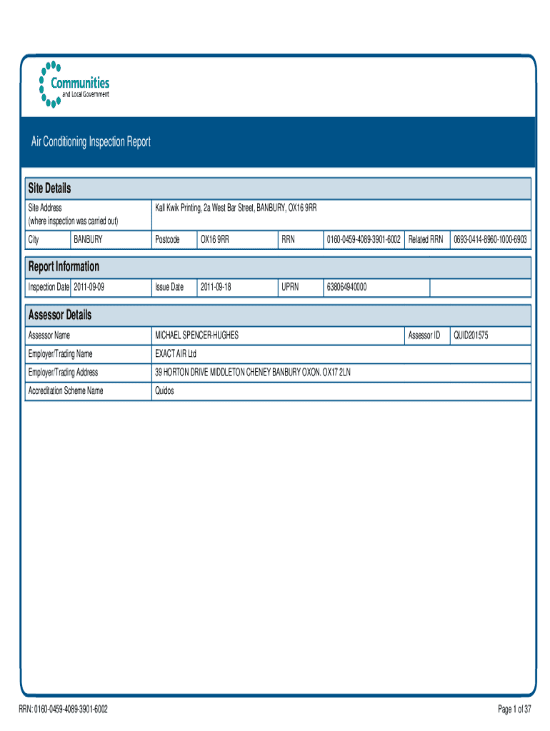 Air Conditioning Inspection Report Site Details Site Address (where inspection was carried out)All Win Printing, 2a West Bar Street, DANBURY, OX16 9RRCityPostcodeOX16 9RRRRN01600459408939016002Issue