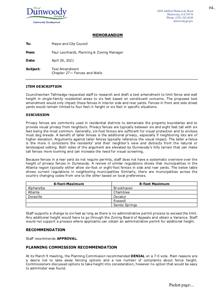 4800 Ashford Dunwoody Road Dunwoody, GA 30338 Phone: (678) 3826800 Dunwoody. Memorandum To:Mayor and City Councilor:Paul Leonard, Planning & Zoning Managerial:April 26, 2021Subject:Text Amendment