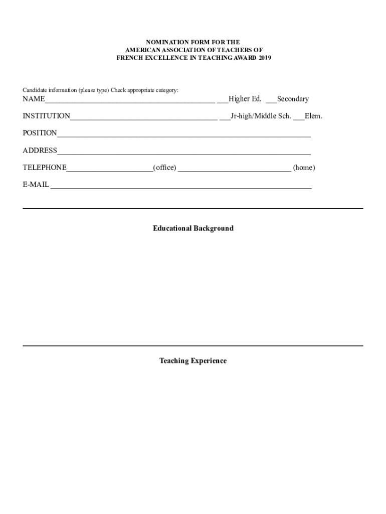 NOMINATION FORM FOR THE AMERICAN ASSOCIATION OF TEACHERS OF FRENCH EXCELLENCE IN TEACHING AWARD 2019Candidate information (please type) Check appropriate category:NAME___ ___Higher Ed. ___Secondary