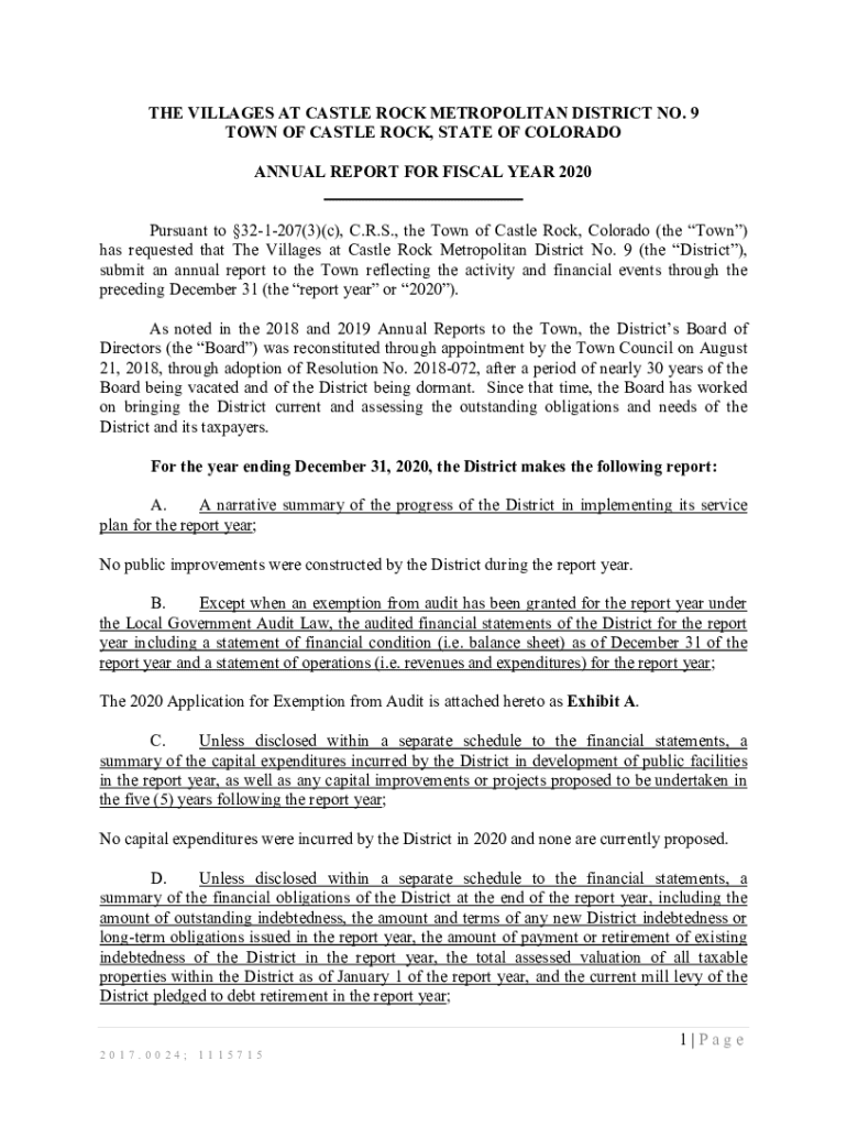 THE VILLAGES AT CASTLE ROCK METROPOLITAN DISTRICT NO. 9 TOWN OF CASTLE ROCK, STATE OF COLORADO ANNUAL REPORT FOR FISCAL YEAR 2020 Pursuant to 321207(3)(c), C.R.S., the Town of Castle Rock, Colorado