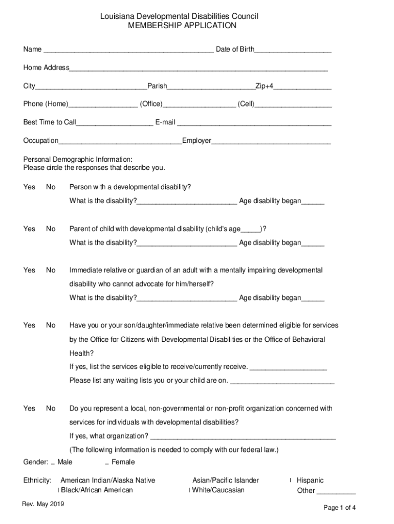 Louisiana Developmental Disabilities Council MEMBERSHIP APPLICATION Name ___ Date of Birth___ Home Address___ City___Parish___Zip+4___ Phone (Home)___ (Office)___ (Cell)___ Best Time to Call___ Email