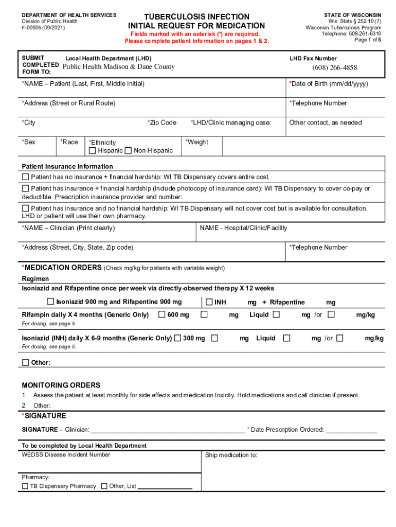 DEPARTMENT OF HEALTH SERVICES Division of Public Health F00905 (09/2021)SUBMIT COMPLETED FORM TO:TUBERCULOSIS INFECTION INITIAL REQUEST FOR MEDICATIONSTATE OF WISCONSIN Wis. Stats 252.10 (7) Wisconsin