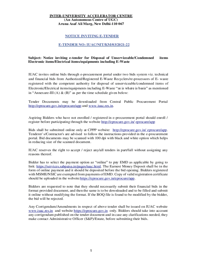 Get the free Notice inviting e-tender for Disposal of Unserviceable ... - IUAC
