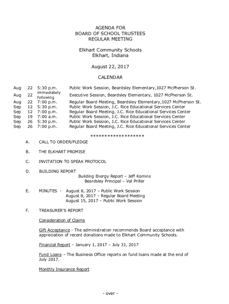 AGENDA FOR BOARD OF SCHOOL TRUSTEES REGULAR MEETING Elkhart Community Schools Elkhart, Indiana August 22, 2017, CALENDAR Aug225:30 p.m. Public Work Session, Beardsley Elementary,1027 McPherson St.