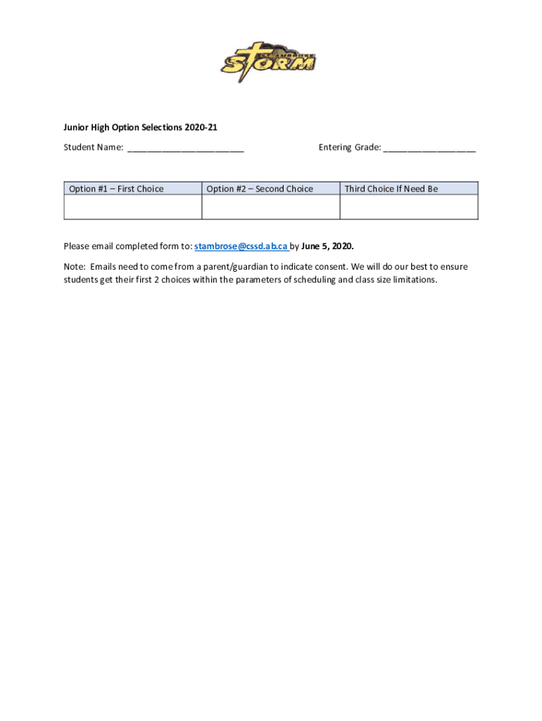 Junior High Option Selections 202021 Student Name: ___Option #1 First Conception #2 Second ChoiceEntering Grade: ___Third Choice If you Need Release email completed form to: stambrose@cssd.ab.ca by