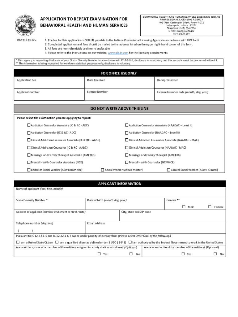 APPLICATION TO REPEAT EXAMINATION FOR BEHAVIORAL HEALTH AND HUMAN SERVICES INSTRUCTIONS:1. The fee for this application is $50.00, payable to the Indiana Professional Licensing Agency in accordance