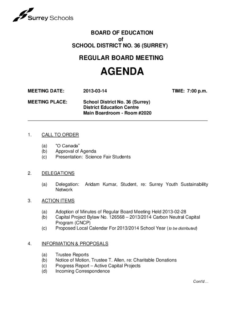 BOARD OF EDUCATION of SCHOOL DISTRICT NO. 36 (SURREY)REGULAR BOARD MEETINGAGENDA MEETING DATE:20130314TIME: 7:00 p.m.MEETING PLACE:School District No. 36 (Surrey) District Education Center Main Boardroom