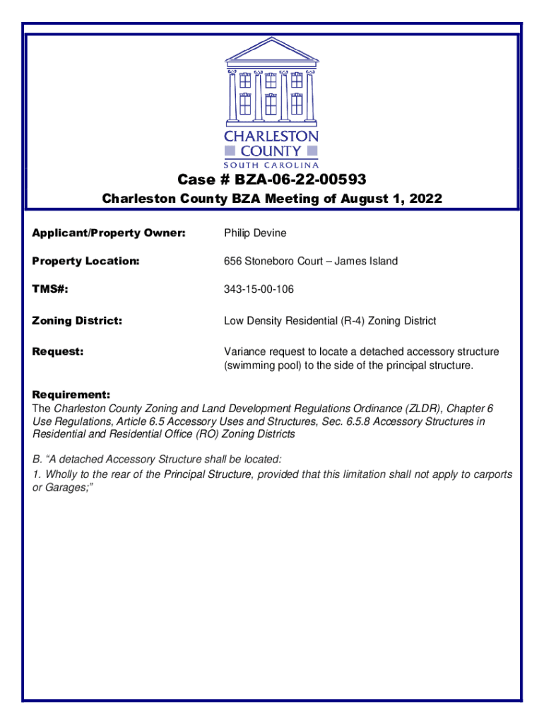 Case # BZA062200593 Charleston County BZA Meeting of August 1, 2022, Applicant/Property Owner:Philip DevineProperty Location:656 Stonework Court James Island TMS#:3431500106Zoning District:Low Density
