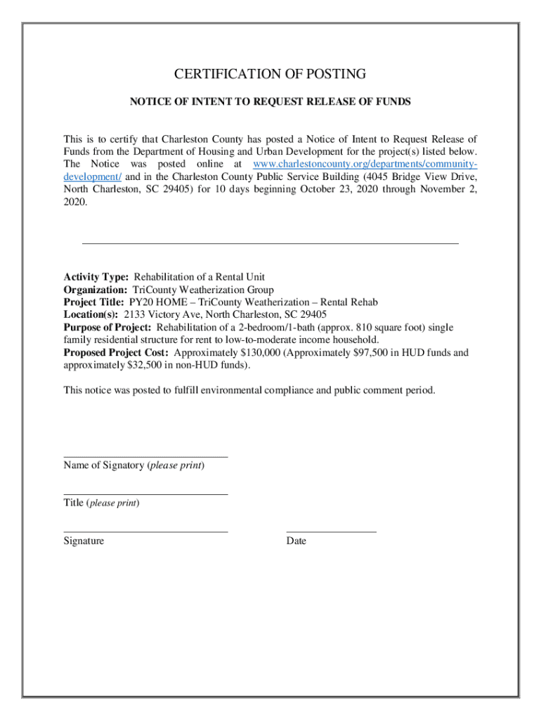 CERTIFICATION OF POSTING NOTICE OF INTENT TO REQUEST RELEASE OF FUNDSThis is to certify that Charleston County has posted a Notice of Intent to Request Release of Funds from the Department of Housing