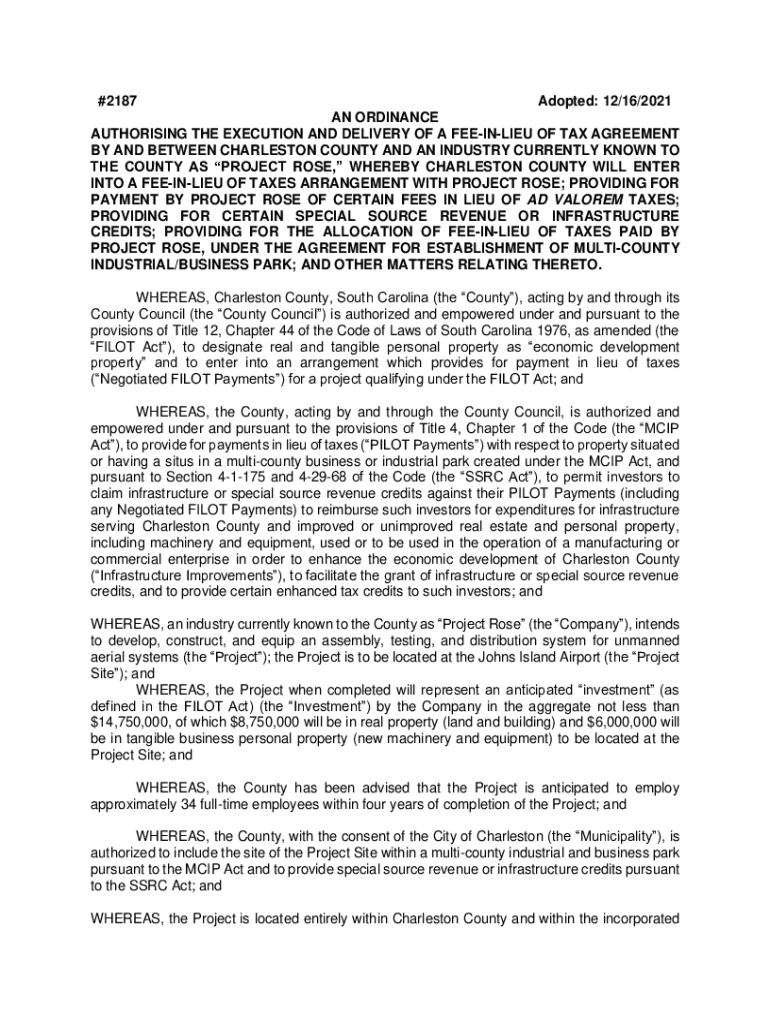#2187Adopted: 12/16/2021 AN ORDINANCE Authorizing THE EXECUTION AND DELIVERY OF A FEEINLIEU OF TAX AGREEMENT BY AND BETWEEN CHARLESTON COUNTY AND AN INDUSTRY CURRENTLY KNOWN TO THE COUNTY AS PROJECT