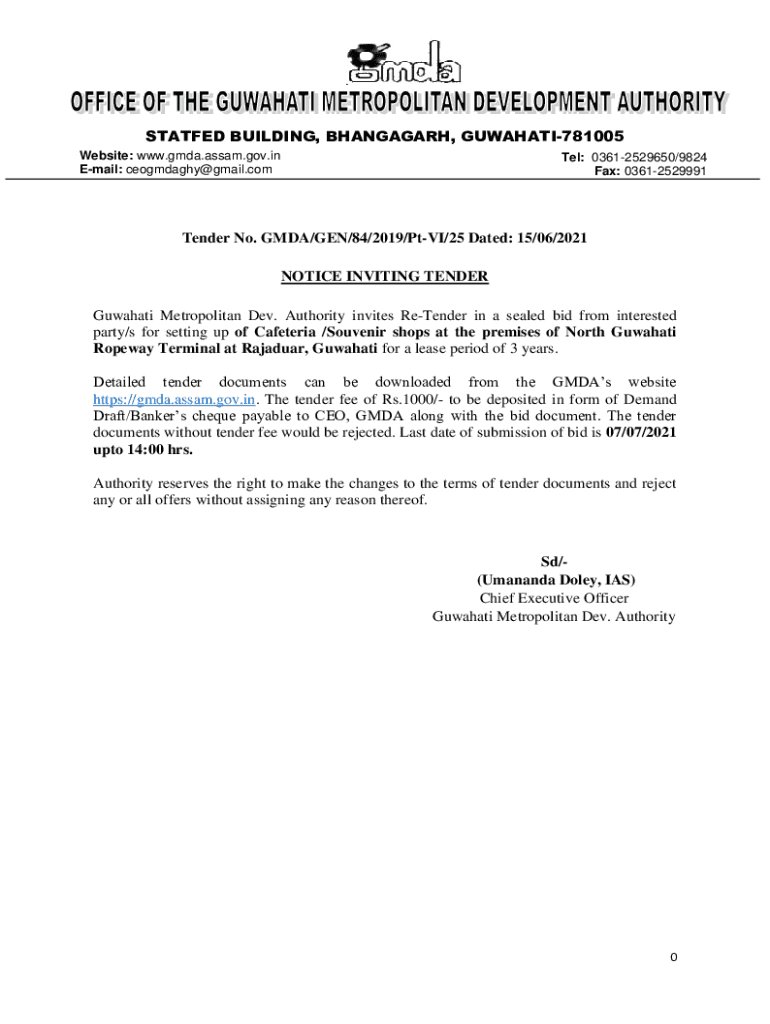 STATED BUILDING, CHANDIGARH, GUWAHATI781005 Website: www.gmda.assam.gov.in Email: ceogmdaghy@gmail.comTel: 03612529650/9824 Fax: 03612529991Tender No. GMD/GEN/84/2019/PTV/25 Dated: 15/06/2021 NOTICE