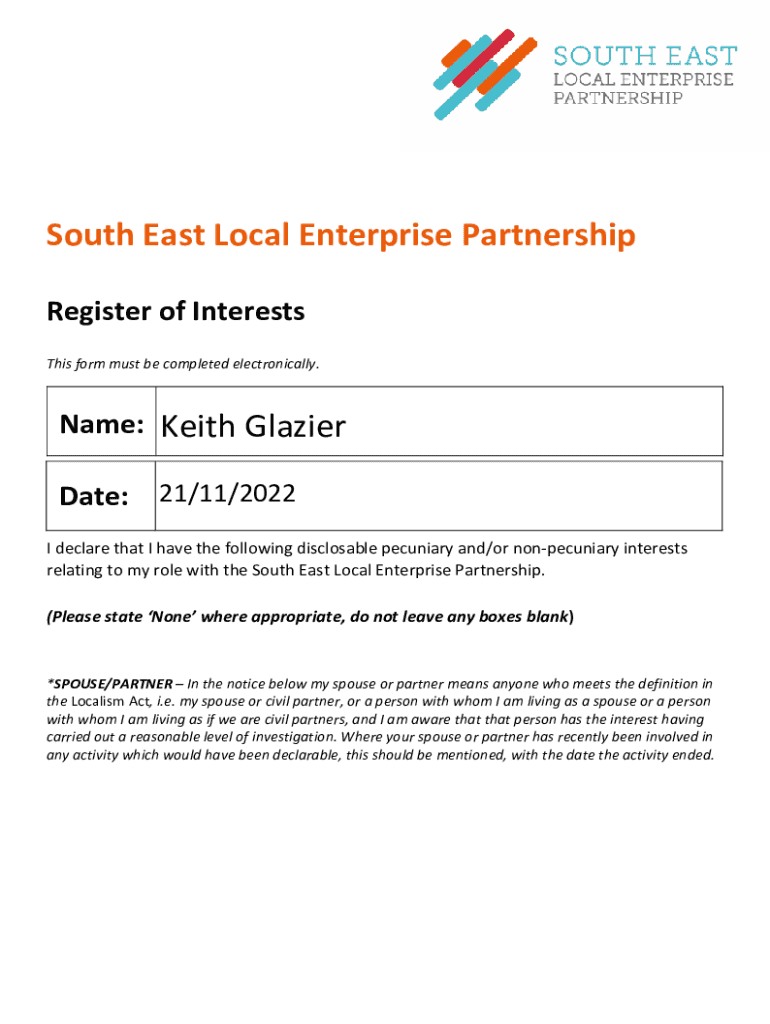 SouthEastLocalEnterprisePartnership RegisterofInterests Thisformmustbecompletedelectronically. Name: Keith Glazier Date: 21/11/2022 IdeclarethatIhavethefollowingdisclosablepecuniaryand/ornonpecuniaryinterests