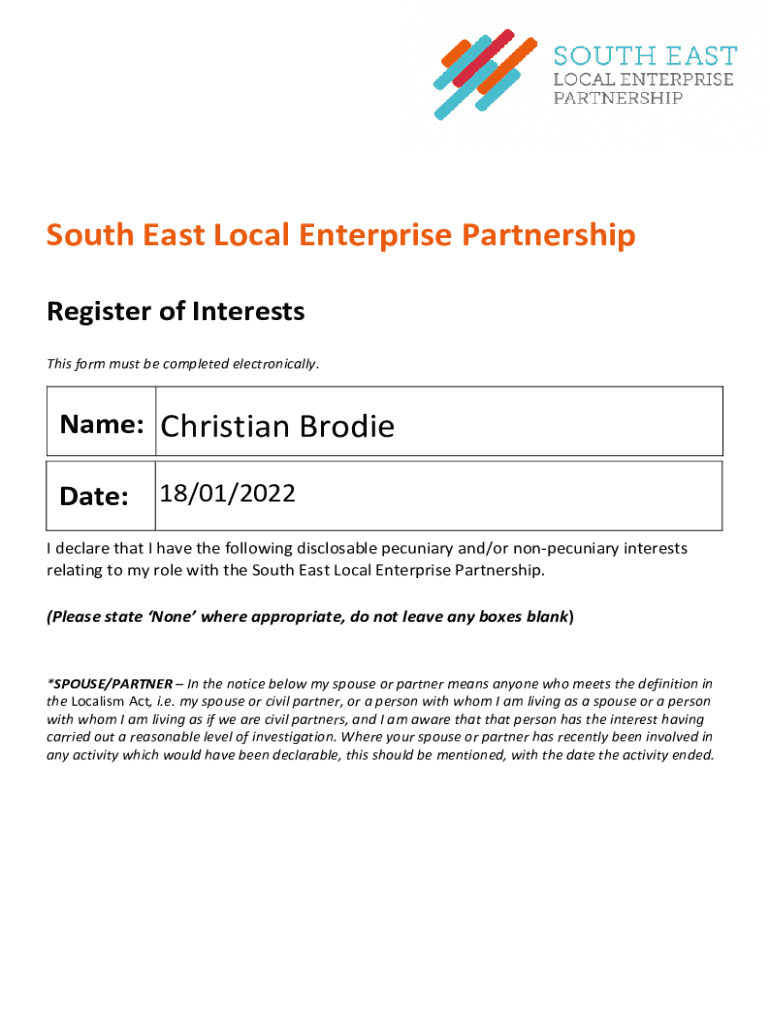 SouthEastLocalEnterprisePartnership RegisterofInterests Thisformmustbecompletedelectronically. Name: Christian Brodie Date: 18/01/2022 IdeclarethatIhavethefollowingdisclosablepecuniaryand/ornonpecuniaryinterests