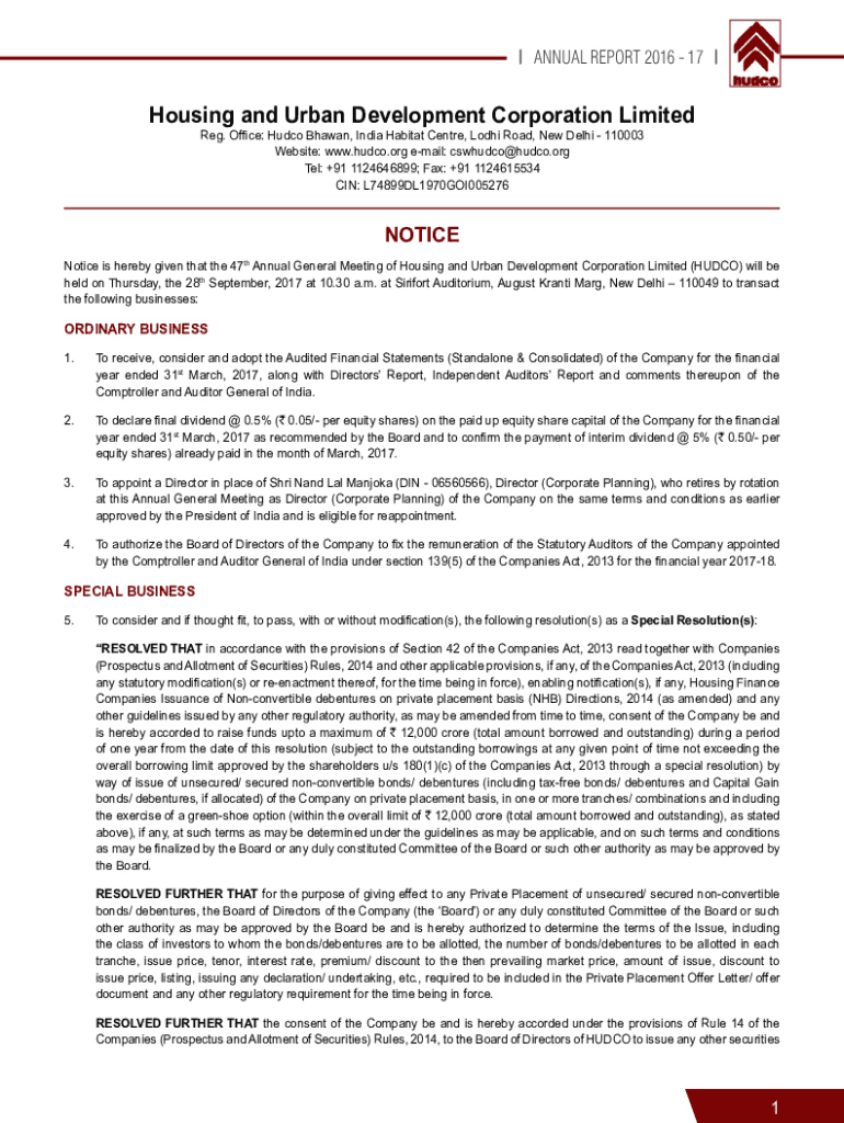 ANNUAL REPORT 2016 17Housing and Urban Development Corporation Limited Reg. Office: Audio Shawn, India Habitat Center, Lodi Road, New Delhi 110003 Website: www.hudco.org email: cswhudco@hudco.org