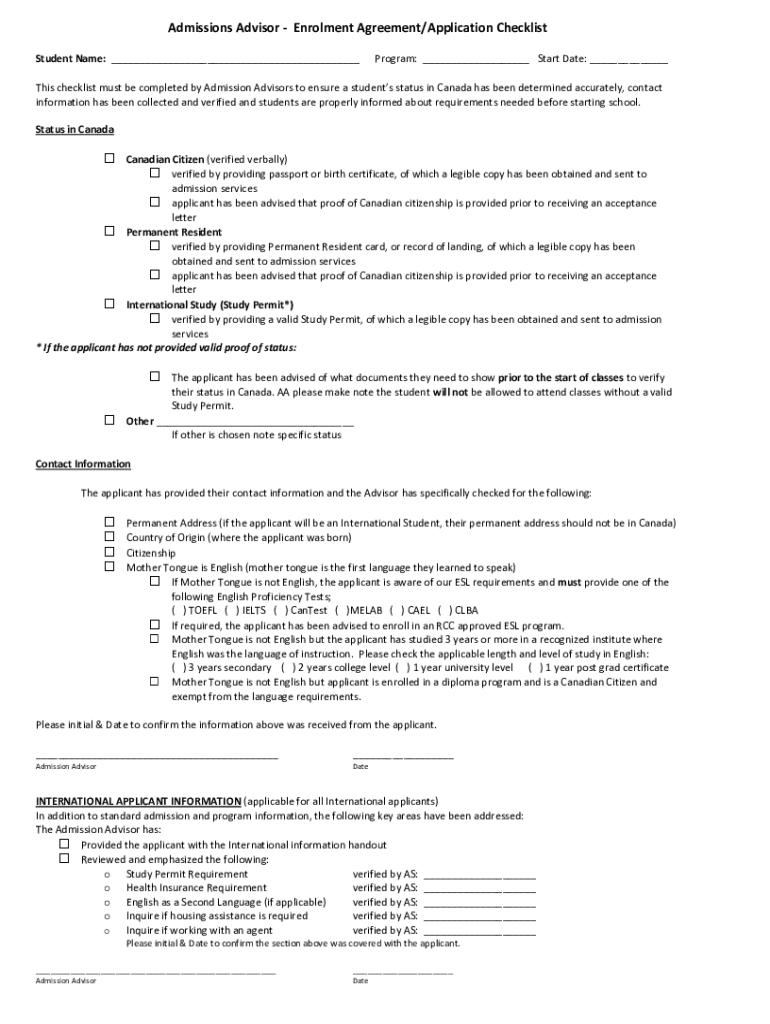 Admissions Advisor Enrollment Agreement/Application Checklist Student Name: ___Program: ___ Start Date: ___This checklist must be completed by Admission Advisors to ensure a students' status in Canada