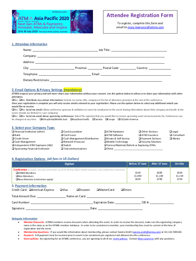 Attendee Registration Form To register, complete this form and email to Mary.lawrence@atmia.com1. Attendee Information Name: ___ Job Title: ___ Company: ___ Address: ___ City: ___ Province: ___ Postal