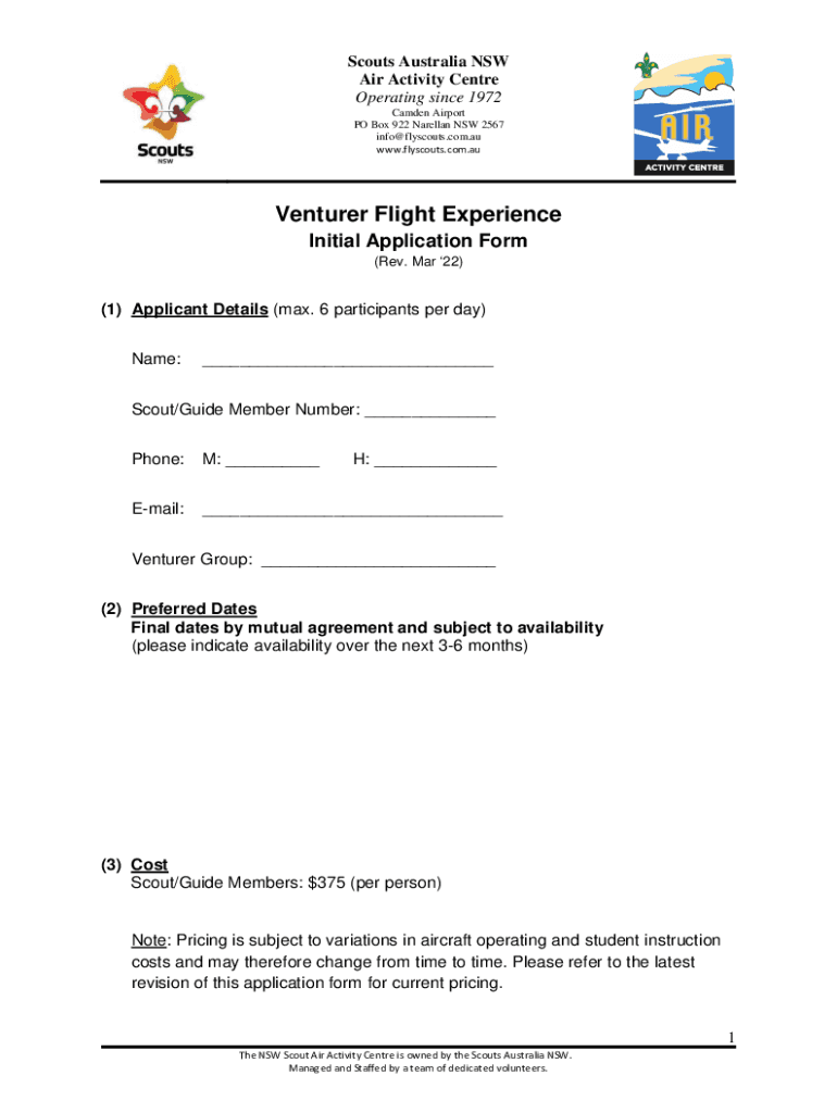 Scouts Australia NSW Air Activity Center Operating since 1972 Camden Airport PO Box 922 Harlan NSW 2567 info@flyscouts.com.au www.flyscouts.com.auVenturer Flight Experience Initial Application Form
