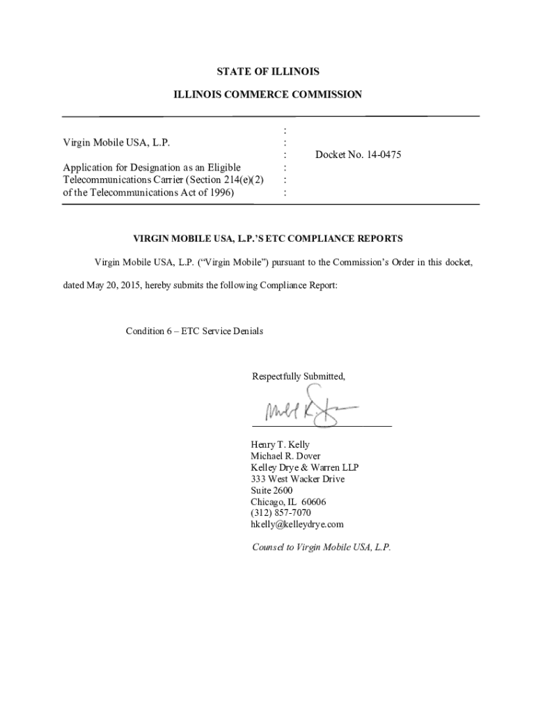 STATE OF ILLINOIS COMMERCE COMMISSIONVirgin Mobile USA, L.P. Application for Designation as an Eligible Telecommunications Carrier (Section 214(e)(2) of the Telecommunications Act of 1996): : : :