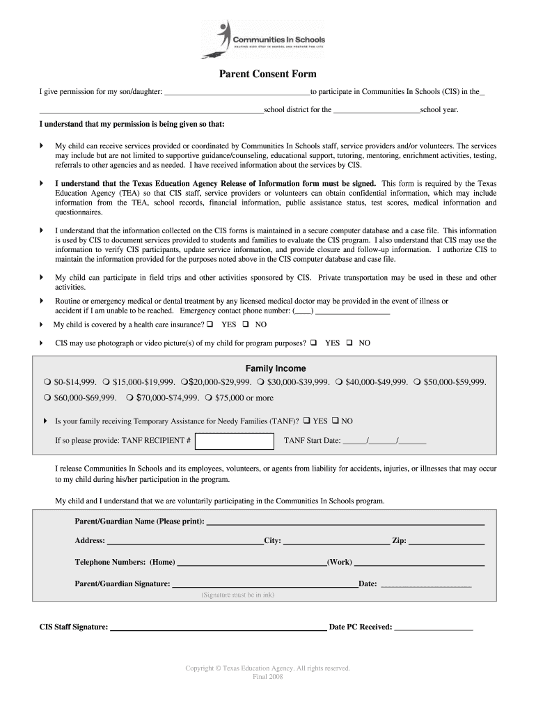 Both the parent or guardian of the child and a member of the Communities In Schools staff must sign the Parent Consent Form. This ensures that proper consent is obtained for the student's participation in CIS programs.
